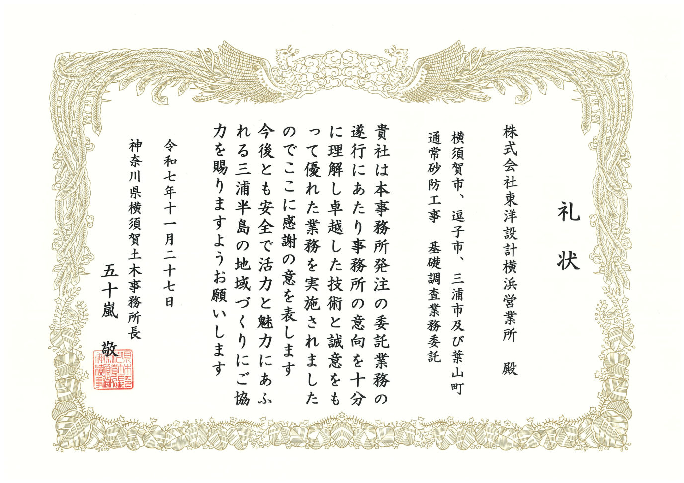 神奈川県横須賀土木事務所より礼状をいただきました